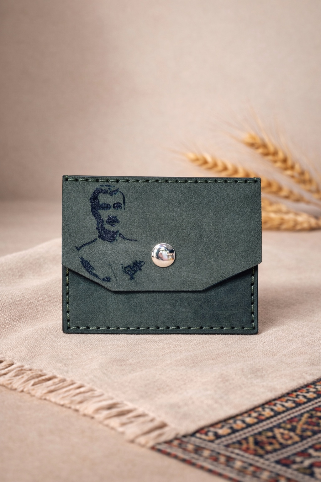 A compact wallet made of genuine leather with an engraved portrait of Garegin Nzhdeh and a button closure.