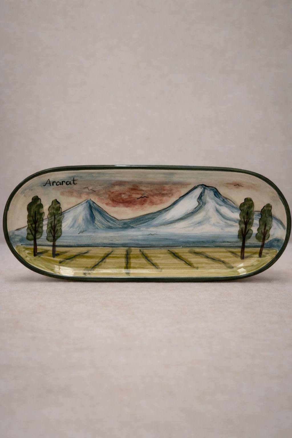 This unique ceramic plate depicts the symbol of Armenia, Mount Ararat, in its majestic and peaceful form. The delicately hand-painted landscape, fields, and trees create a calm and harmonious composition.