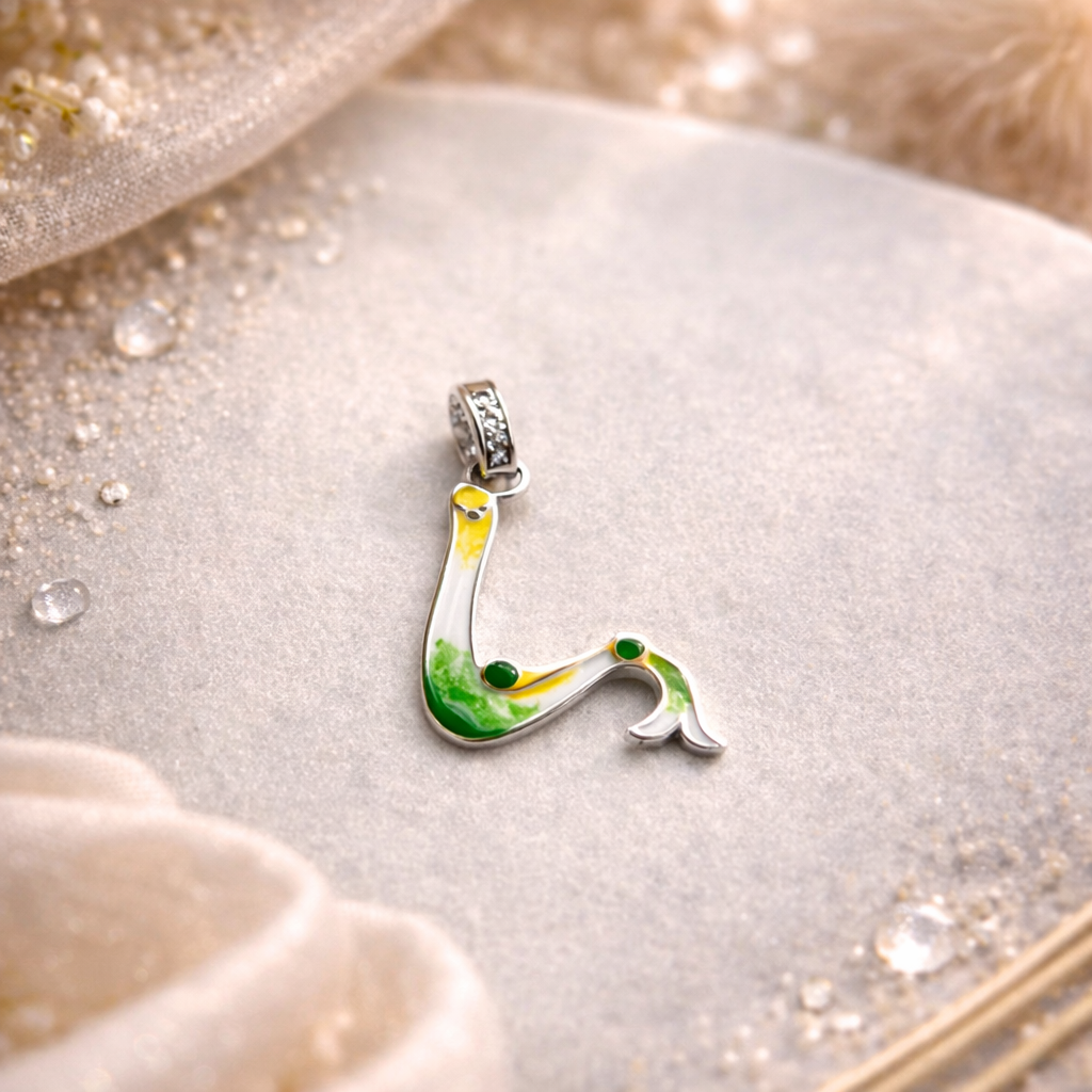 Արծաթյա «Թռչնատառ» կուլոն դեղին և կանաչ էմալով